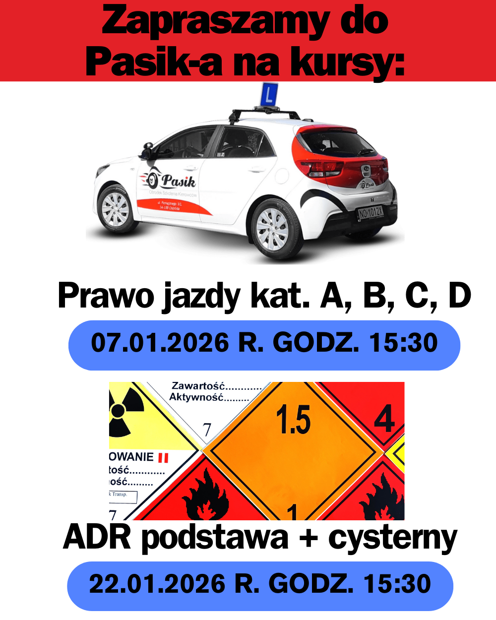 Najbliższy kurs prawa jazdy kat. B, C, D: 07.01.2026 r. godz. 15:30